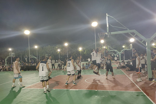 晚上的篮球场格外热闹,耳边不时传来激动的呐喊声,挥洒汗水的少年们、加油助威呐喊的啦啦队,都在灯光的映衬下成为了学校里的一道亮丽风景线。哨声一响,球员们迅速进入状态,比赛正式开始。篮球场上,大家积极跑位、互不相让,各队比分正交替上升——抢球、断球、防守、进攻,各种技术动作接连上演;严守硬对、激烈争夺、迅速传球、完美配合,赢得场下观众阵阵欢呼。现场气氛热烈紧张,运球的节奏感、传球的默契度、进球的成就感、绝杀之后的畅快感,这些是专属于球员们的快乐!一个个敏捷灵动的身影、一声声高昂的呐喊、一阵阵进球后的喝彩,构成了一幅激动人心的赛场风景。