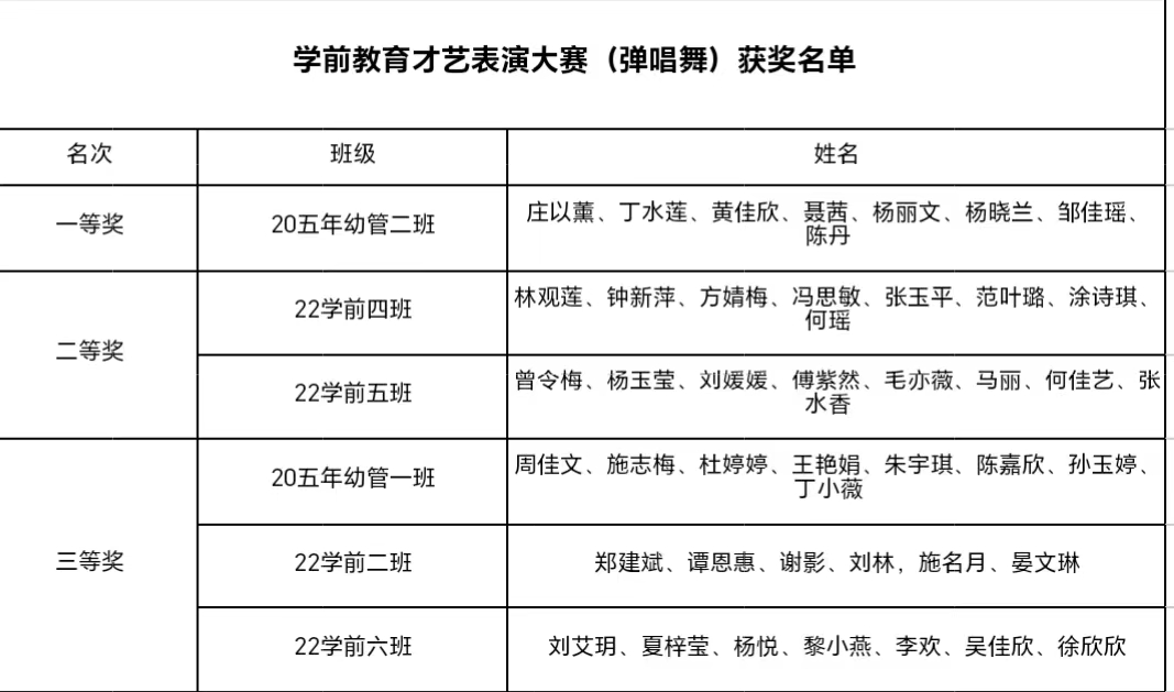 学前教育才艺表演大赛(弹唱舞)获奖名单